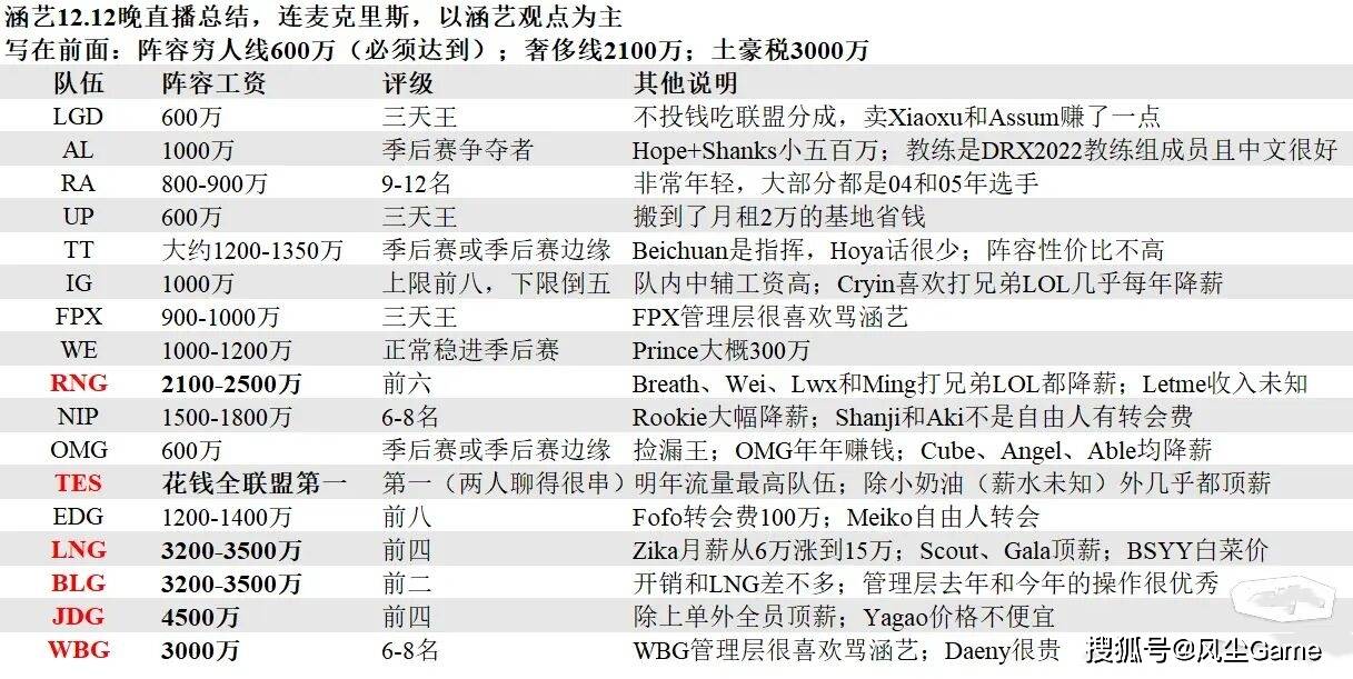LPL冬季转会期窗口,在12月12日已经正式关闭,经历了超过半月的时间,各大战队新赛季的阵容也全部确定,知名爆料博主涵义,在今日的直播中,公布了各大战队新阵容的花费,TES在买下Meiko之后,成为了烧钱最多的队伍,JDG续约选手,也花了将近4500万之多。