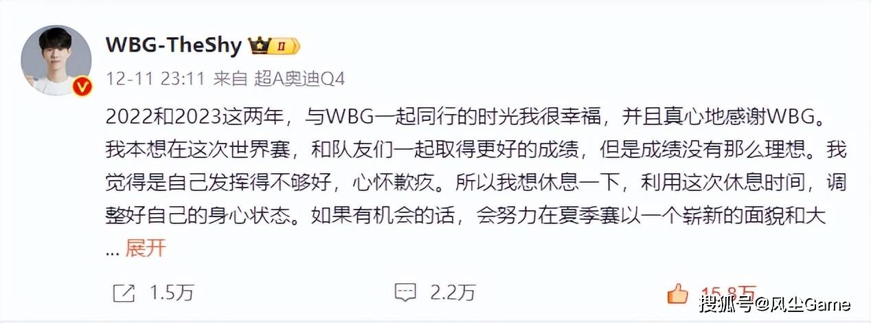 在TheShy选手休息之后,WBG也没有完全摆烂,新赛季的阵容,依旧是花了3000多万,但能拿到什么样的成绩,就很难预料了,至少S13的世界亚军,应该是无法企及了,和TheShy一同失业的,还有他的两位老队友,打野Ning和辅助Baolan,在新赛季都已经确定离队了。