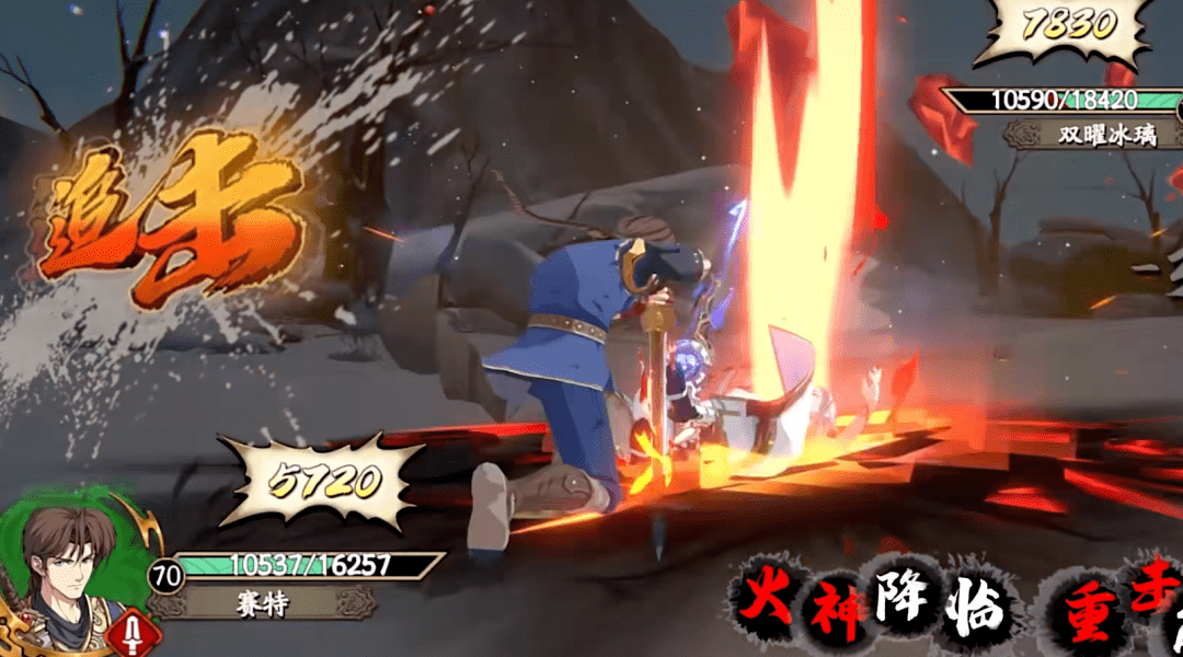 然后赛特在PV中使用了一次【无方飞剑】,接着就来了个“追击”,这真是延续了火系的一贯传统啊!砍王有,安天帝有,接着的赛神你居然也有,这点维一猜测是在赛特天赋中的自带效果,因为这个效果的名字叫【重击·崩山】,应该和之前李靖、妮可天赋中的【重击·神威】与【重击·散魂】一样是个概率触发的效果,气血越高则追击的概率越大吧。