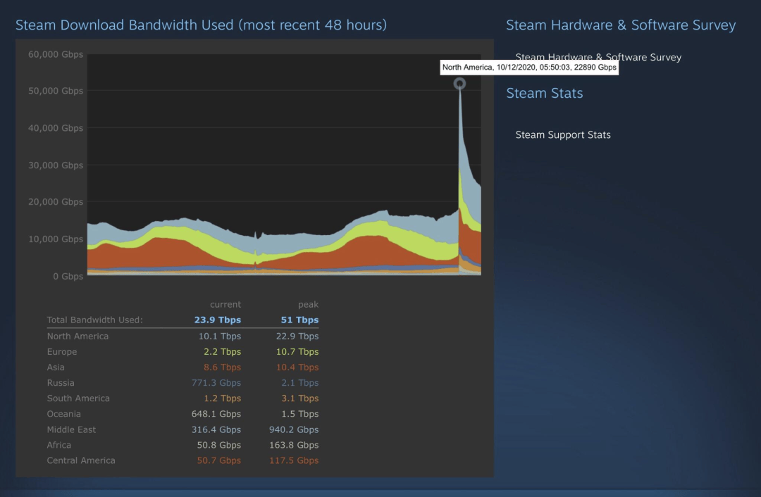 此前,Steam平台下载使用带宽达到的峰值数据是由2020年发售的《赛博朋克 2077》达成的,该游戏于2020年12月10日解禁时,Steam的下载使用带宽一度达到了51Tbps。