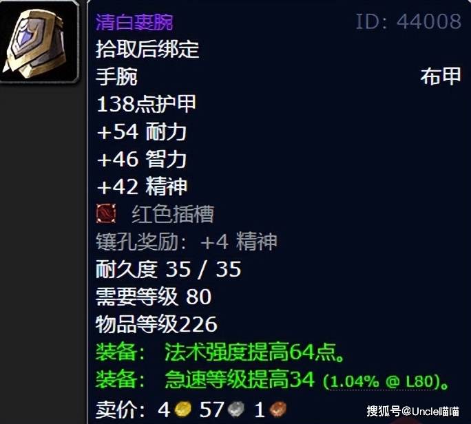 既然说到了法系DPS,那么往年热门的清白裹腕还是依旧极品,值得推荐给大家,而且基于80的天赋系统,他是不挑职业的存在。目前来看,对比现阶段的226布甲护腕,可能就法伤欠缺,但是属性全面和红色插槽加持的他,必须恐怖如斯直戳天花板,喵叔100%推荐!