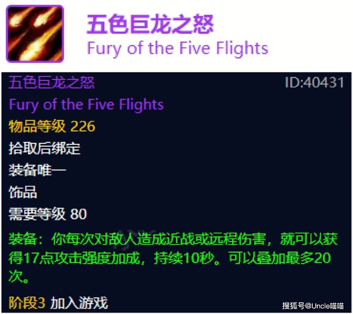 和龙魂图典一个境遇,五色巨龙之怒的话也是同样每次攻击强度拔高加了1点。对于五色巨龙之怒,喵叔以前狂暴战倒是体验过,可以是可以,但是并不能戳天花板,另外值得注意的是很多惩戒骑和冰DK大兄弟表示嘎嘎好用,所以大家还是可以眼观六路耳听八方坐等捡漏体验下的。