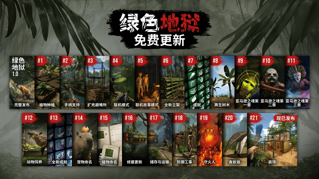 在研发《绿色地狱》的时候,他们先以小众题材、硬核玩法确立差异化基础;再通过近8年120多次内容和玩法更新,摸清玩家喜好,将产品打磨完善;最终以小博大,逐步收获生存建造玩家的普遍认可。