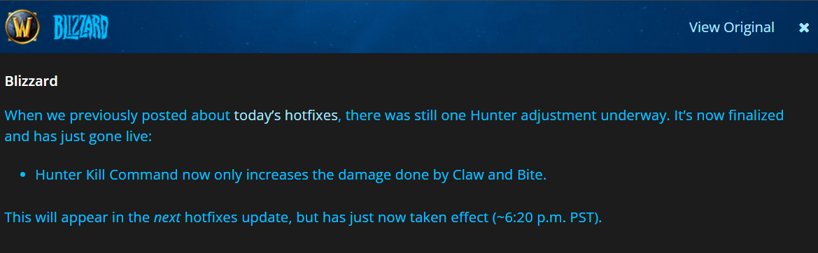 另外,暴雪的新补丁上线之后,很多猎人已放弃蝎子,但风蛇的表现过于突出(一个1100多血的圣骑士,野外可能被带风蛇的猎人3秒干翻),导致暴雪又发蓝贴热修。现在杀戮命令只能对爪击和撕咬起效了,风蛇虽然也能学撕咬,但核心技能闪电吐息不吃杀戮了,地位大幅下降,更多猎人转带传统的猫科和迅猛龙。