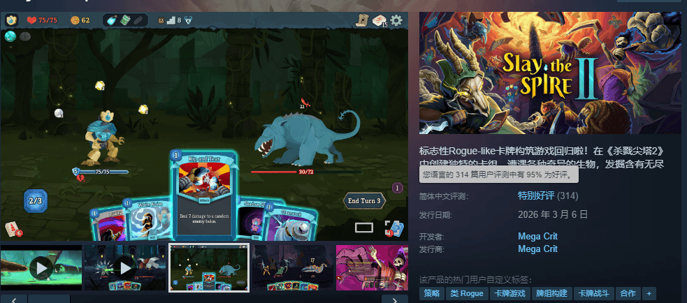 紧接着在今天(3月6日),开创了“尖塔like”的肉鸽卡牌游戏《杀戮尖塔》的续作——《杀戮尖塔2》EA版正式发售。