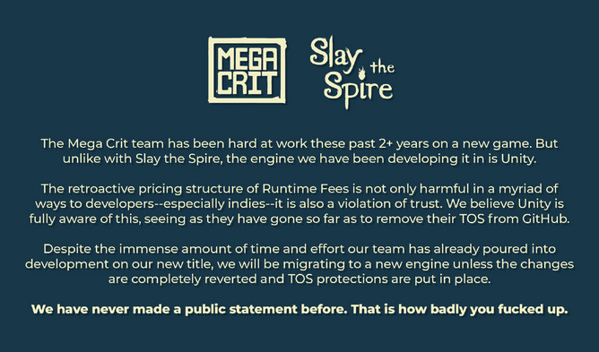 然而伴随着这种开发规模的升级,Mega Crit却因环境变化选择在2023年踩了一次急刹车,这或许称得上是第二次意外——彼时Unity宣布将改变收费政策,在其他厂商和工作室发出反对声音时,Mega Crit率先宣布弃用Unity,即便他们已经花费了两年多的时间来开发他们的下一款游戏。声明中虽然并未指明是哪一款游戏,但不少人推测很可能就是《杀戮尖塔2》。