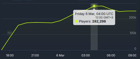 而待网络稳定后,游戏不仅口碑在第一时间稳住、拿下95%好评率,同时市场反响也超出很多人的预期, 最高在线人数一路飙升至28万,且同时在24个国家和地区的Steam热销榜登顶。