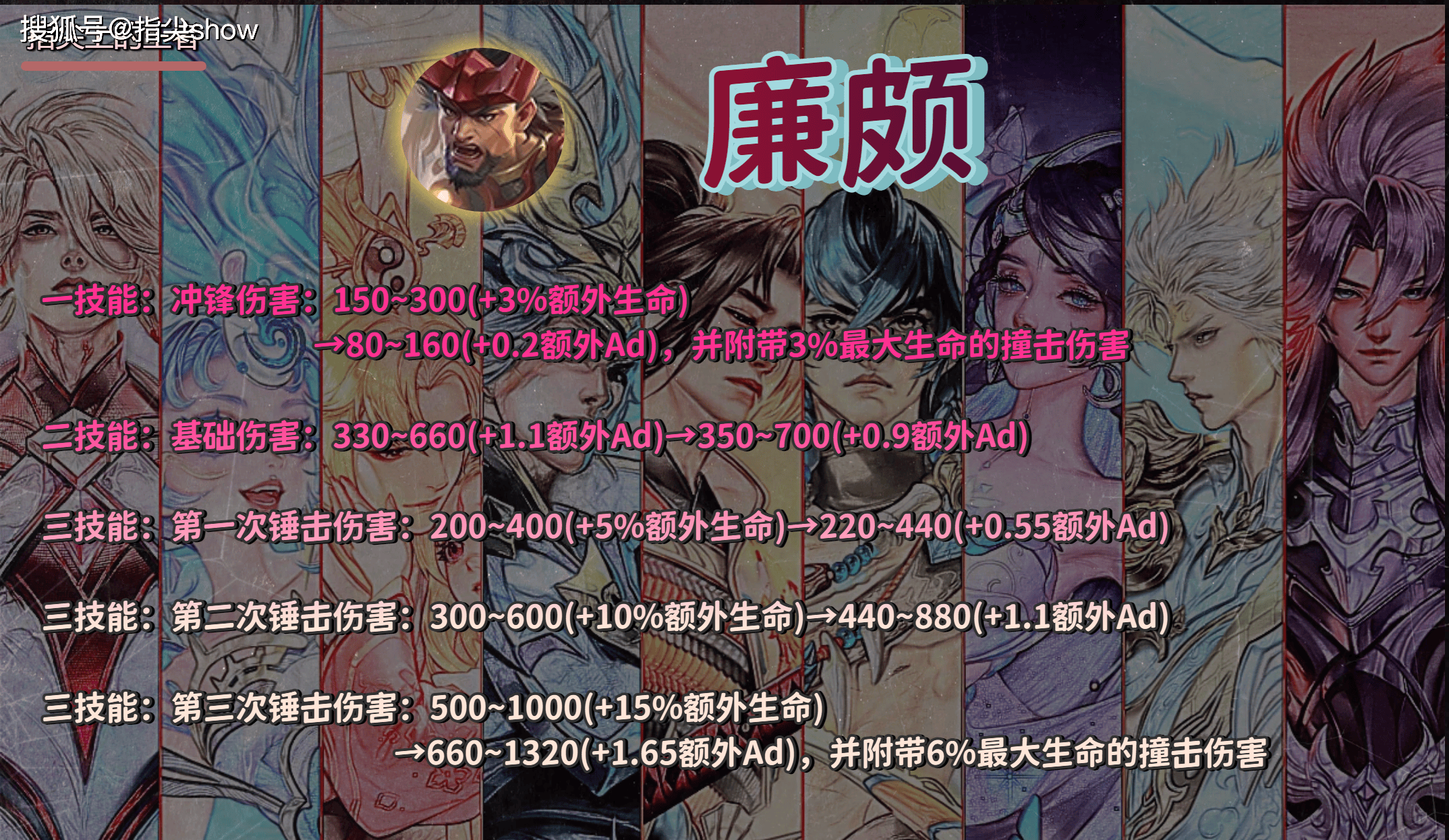 廉颇此前的数值中,只有二技能是AD加成,13技能都是生命值加成,是为了让他更契合走辅助位的防具,这个设定已经 好多个版本了,原本廉颇在升级重做之后有一段时间都是打边路的,后来数值调整就更适合辅助了。