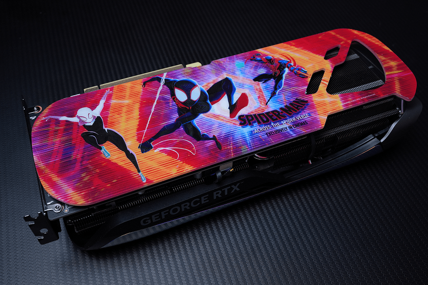 接下来的RTX 4070TI AMP AIRO SPIDERMAN来头可不小,与影视IP合作的显卡你见过吗?索泰这次加入了蜘蛛侠宇宙,在PC游戏世界里助你一臂之力。在打开外包装的一瞬间,首先引入眼帘的是不是显卡本体,而是一张磁吸蜘蛛侠背板,以及许多DIY风扇贴纸和蜘蛛侠主角贴纸。下一层还有一个盲盒手办以及专属帆布袋。