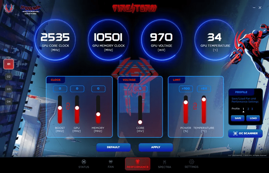 在FireStorm软件上,主题UI也是定制的蜘蛛侠元素,下载安装,开启监控,自动识别。功能齐全,灯光颜色,风扇转速等调节起来一目了然。