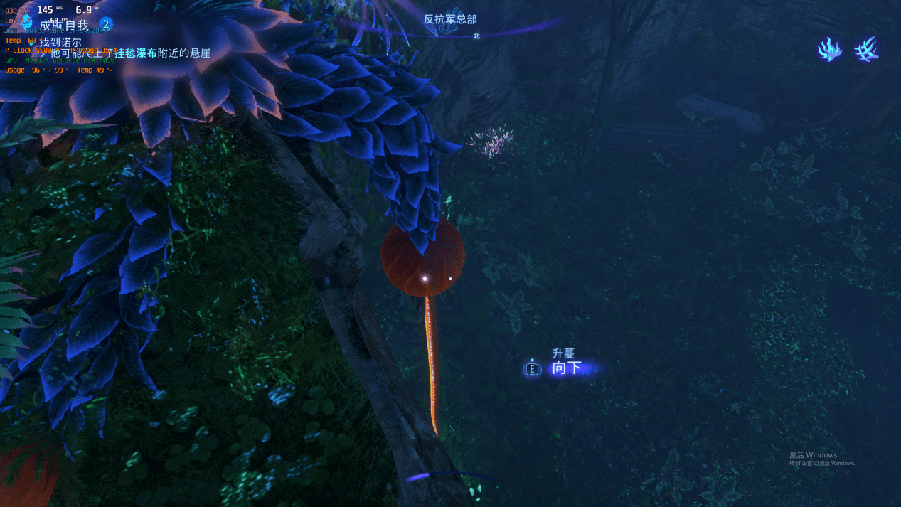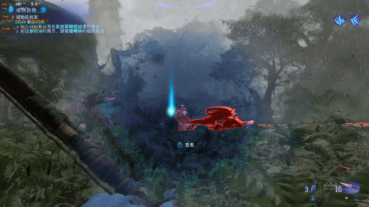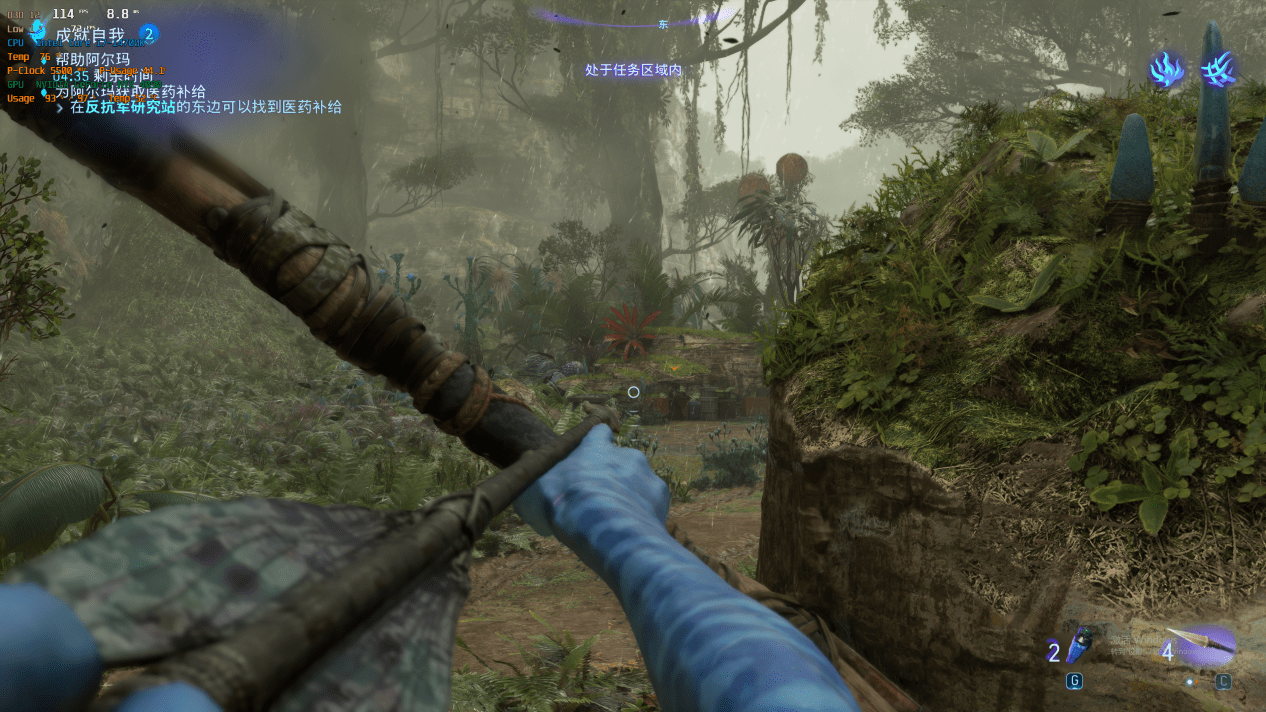 潘多拉的地图十分庞大,玩家被赋予了极高的自由度来探索地图,但是丰富的植被覆盖和地势的高低落差时常会出现无法前往目的地,在目标周围转圈的情况。游戏的指引向导也不够明确,大致方位可以通过纳威感应来确定。这也是游戏中比较有意思的设定,有点像杰洛特的猎魔感官,你可以用它来识别植物,识别气味,看到脚印,探查敌人等等。在战斗中这是必备且常用的技能