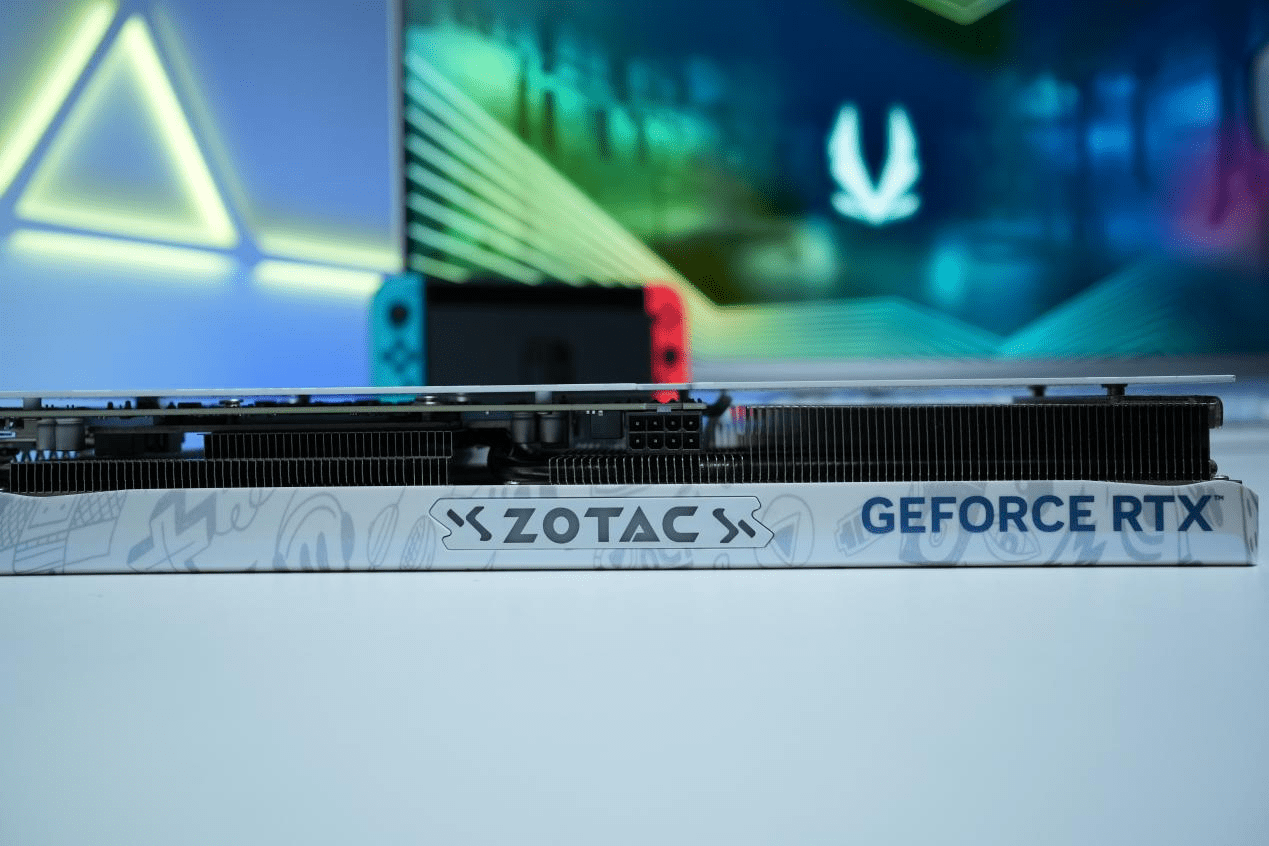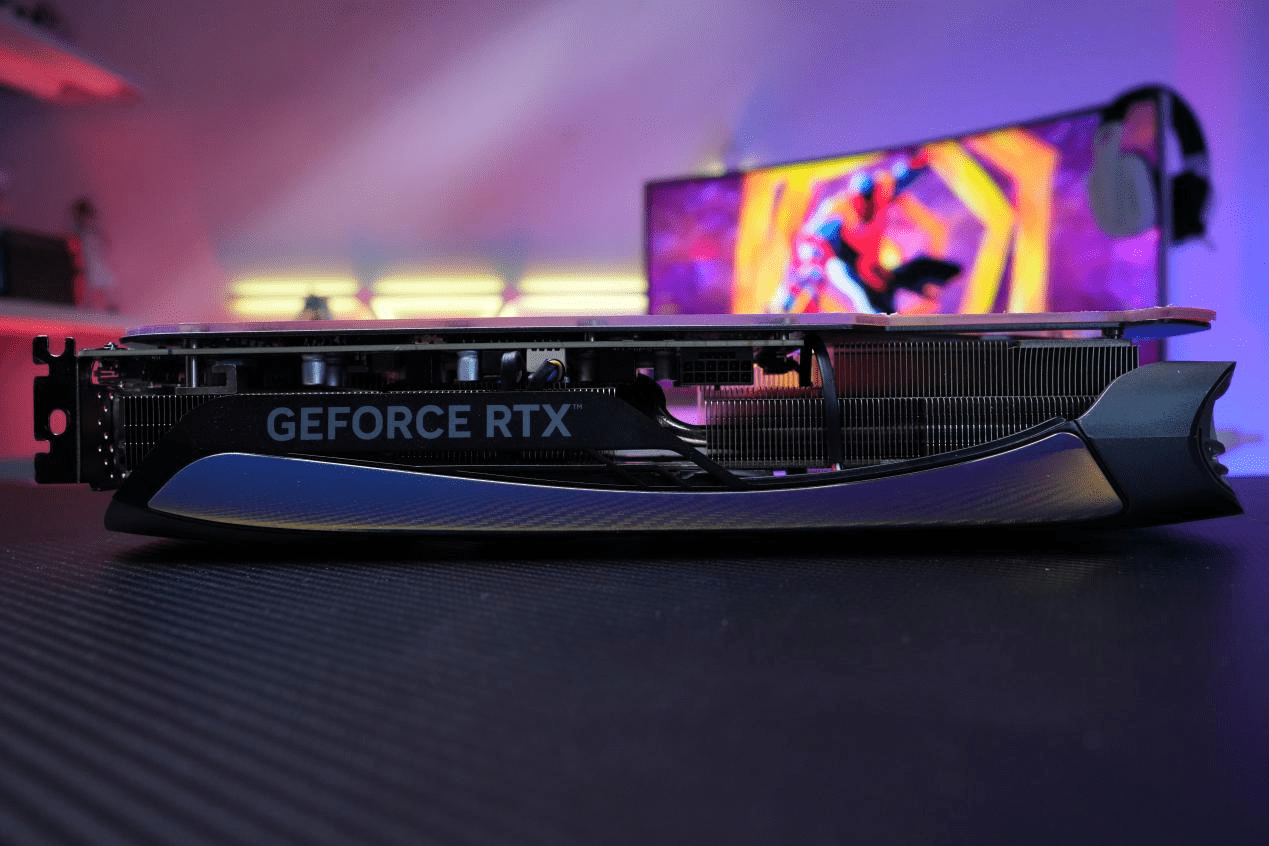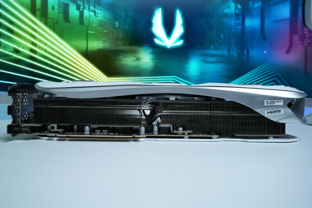 暗影疾风三风扇,更加的静音,智能Freeze风扇启停技术,动静由AI掌握,噪音噪音更小,提供更佳的使用体验而且增加风扇寿命。镜面抛光镀镍铜底座,精密焊接工艺将底座、热管、鳍片形成一体模组,更快导出GPU热量;显存、MOS管、电感等发热元件覆有高导热系数的导热贴,把热量快速传导到散热模块上,加速散热。尾部特别加高鳍片,增加了气流和鳍片接触面积;背板尾部特有开孔设计,让风扇的气流低阻穿透鳍片和背板,实现更高效的散热。
