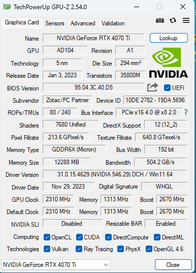 参数规格上,核心架构:NVIDIA Ada Lovelace,7680颗CUDA处理器,12GB显存容量,GDDR6X显存,默认频率2310MHz,Boost频率2670MHz,显存位宽192bit,整卡功耗285W。