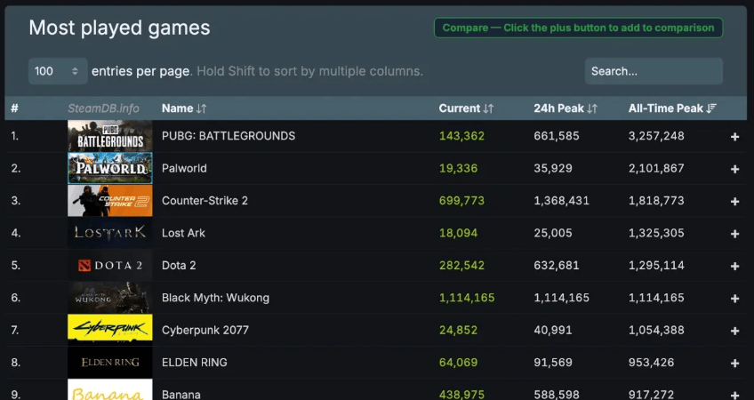 《黑神话:悟空》现已在全球正式发售,已有超一百万玩家涌入游戏。据Steamdb数据显示,截至目前游戏平台Steam峰值人数就已达到111万人,为历史上在线人数最多游戏第六名,前五名均为多人在线游戏。超越了《艾尔登法环》《赛博朋克2077》《博德之门3》等多款大作,预计随着更多玩家进入游戏,该排名还会持续上升。