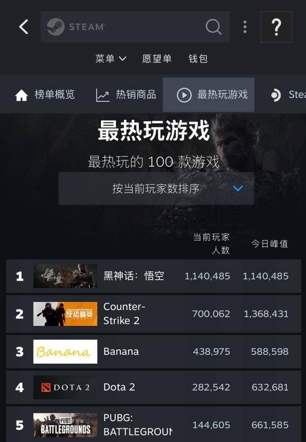 8月20日,国产游戏《黑神话:悟空》上午10时正式上线。截至发稿时,这款游戏在Steam平台的同时在线玩家突破114万,超越《CS2》登顶Steam热玩榜。