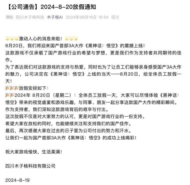 四川木子杨科技有限公司8月19日发布通知,决定在《黑神话:悟空》上线的当天8月20日给全体员工放假一天,让员工尽情体验《黑神话:悟空》带来的视觉盛宴和游戏乐趣,与同事、朋友一起分享这款国产大作的精彩瞬间。公司表示,这次放假是对国产游戏行业的一份支持。
