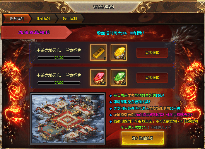 每日在龙城击杀怪物数量达到150只,即可领取免费福利大奖,还可进入爆率超高隐藏地图。