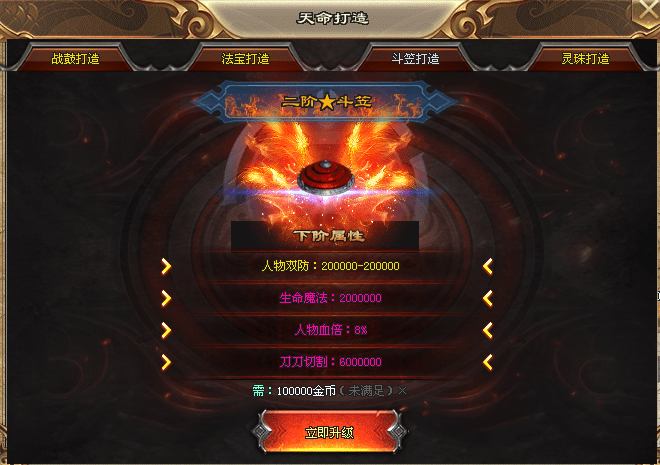 7)优先锻造天命,天命包括战鼓、法宝、斗笠以及灵珠。增加大量切割属性,打怪事半功倍,前期优先升级。