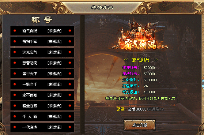 升级称号除了提升大量属性,更有打怪爆率以及吸血属性。吸血只对怪物有效,使用月弧弯刀技能无效。
