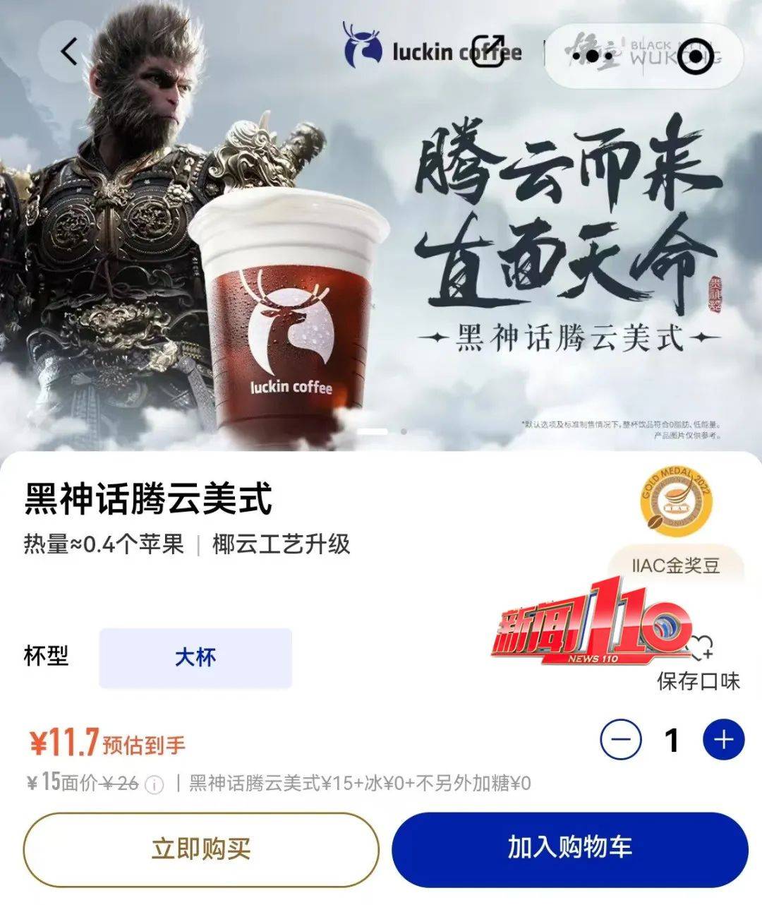 昨日,《黑神话:悟空》与瑞幸咖啡合作推出联名饮品“黑神话腾云美式”。在点单界面可以看到,联名饮品实际到手价与平时冰美式相差不大,单价在9.9元~15.9元。