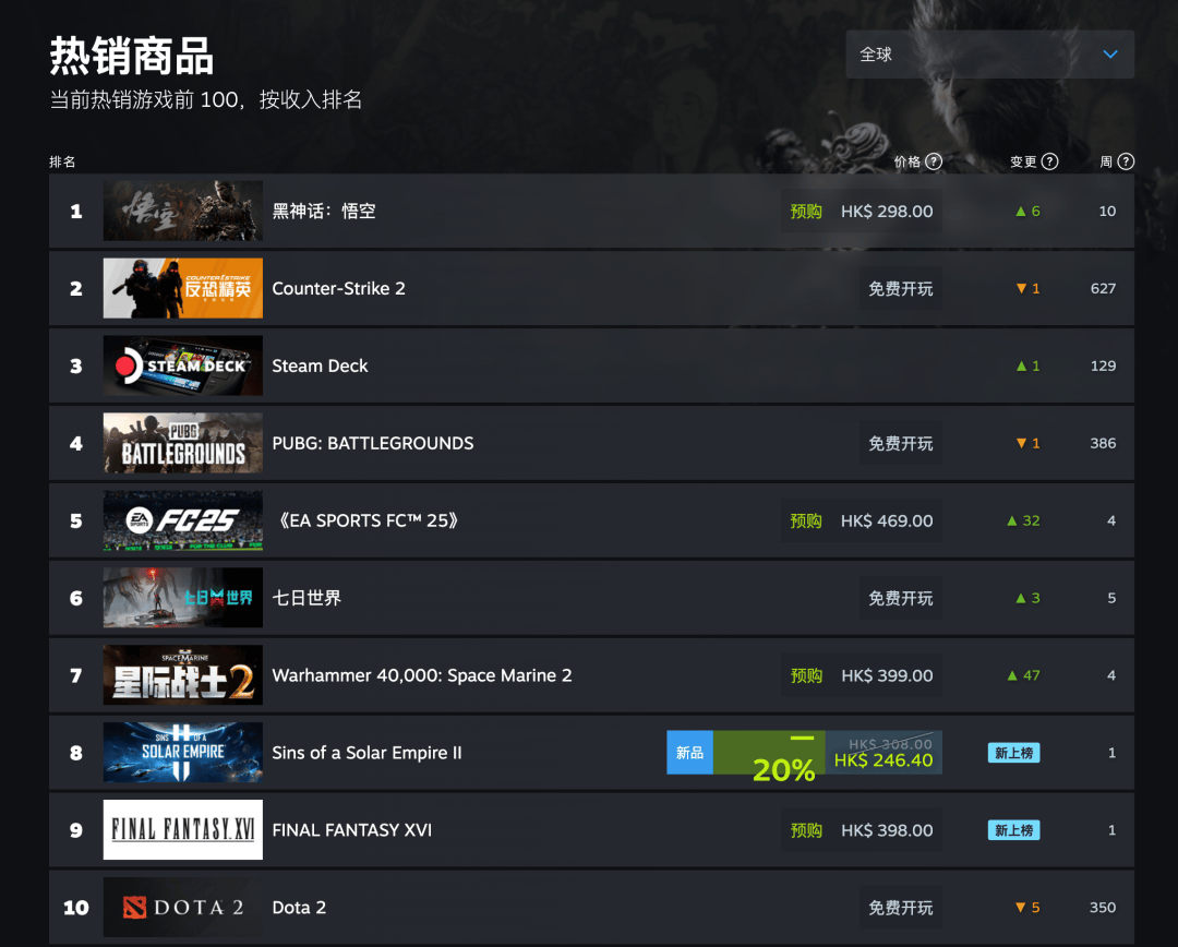 现在,《黑神话:悟空》是 Steam 平台上的全球销量冠军,甚至与游戏本体一并发售的豪华版升级包,都挤进部分地区的销量榜单前十。