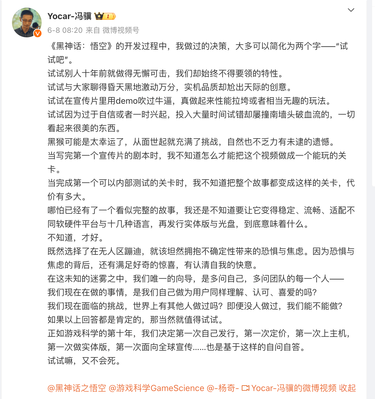 《黑神话:悟空》正式开启预售那天,冯骥说,他在开发过程中做的决策大多都可以简化为两个字,试试。