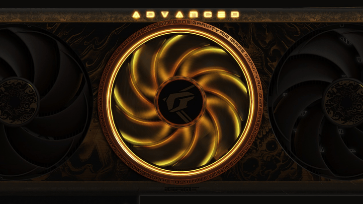 提及到iGame Advanced第 一时间想到的就是标志性的“大红圈”,在RTX 40系列产品当中我们将它命名为「引力之环」,而在融入了《黑神话:悟空》的元素后,圆环经过多次的打磨及调色,最终进化成为「金刚圆环」,灵感来源法宝“金刚琢”,其质地坚硬如锟钢,经过精心铸造。点亮之后与RGB光环形成“双环”设计,可展现无 与伦比的光影效果。当它与iGame Center的多样光效调控技术结合,即被赋予了生命的韵律,展现出令人着迷的灵动气息。同时,金刚圆环的设计还巧妙地融入了中间半透聚风扇叶,打造出一种“视觉停留”的效果,呈现以静制动的美感。