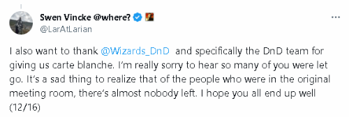 由于在TGA上发言时间太少,拉瑞安首席执行官Swen Vincke在社媒发文感谢了许多帮助《博德之门3》成为现实的人。他透露,早期帮助《博德之门3》项目启动的不少人员几乎都被解雇了,自己对此十分惋惜。这些人员来自代理龙与地下城的全球娱乐公司威世智,这家公司于1999年被出售给孩之宝,后者在本周刚刚经历了大规模裁员,超千名员工受到影响。