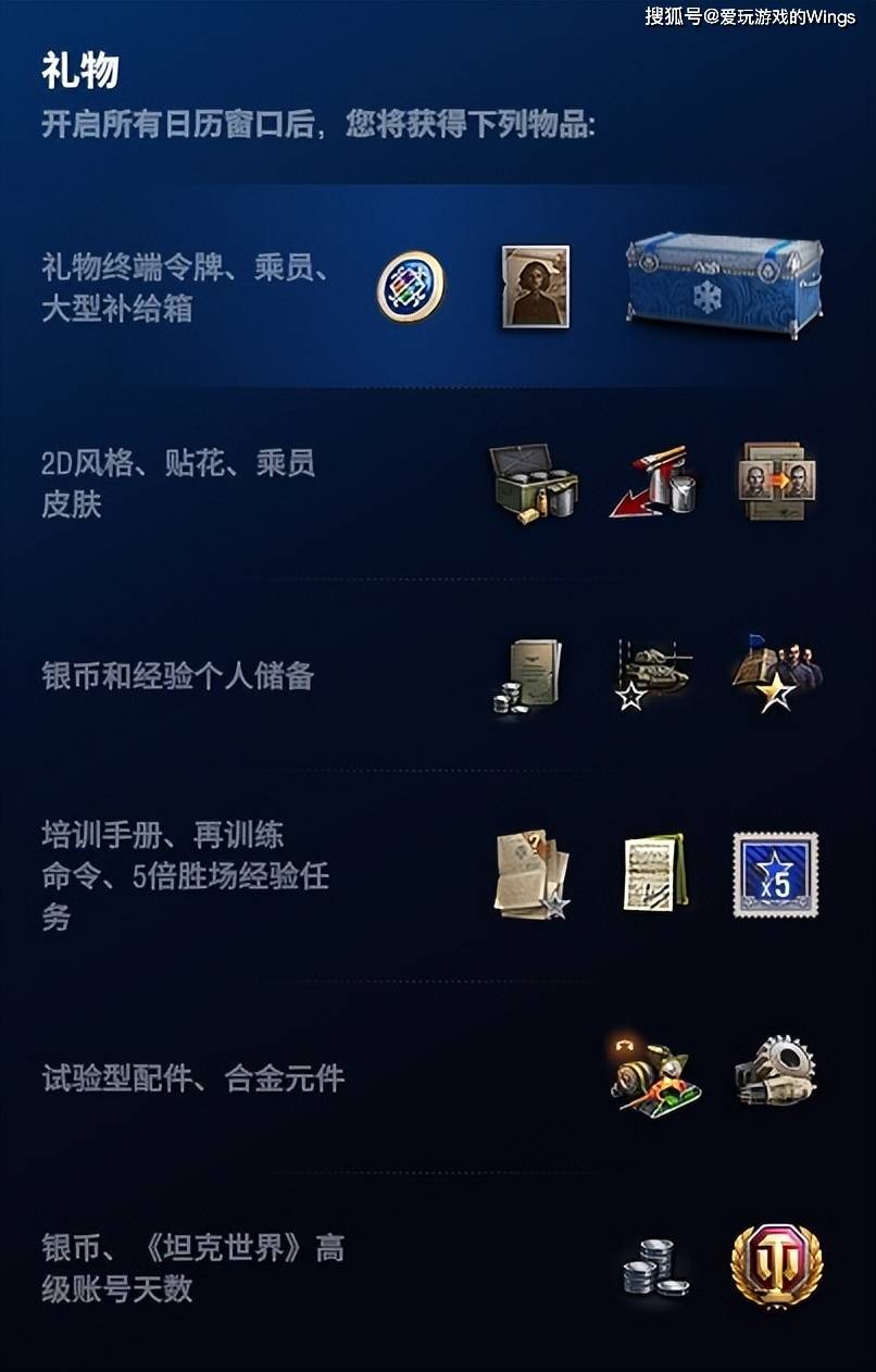 今年的每日精选,可以获得的物品可以看作基础奖励和阶段奖励。基础奖励顾名思义,就是每天登录点击格子就能收获的,有银币、经验个人储备、合金元件和高级账号天数等各种各样的资源奖励,用来解决自己的燃眉之急,或者囤起日常所需~