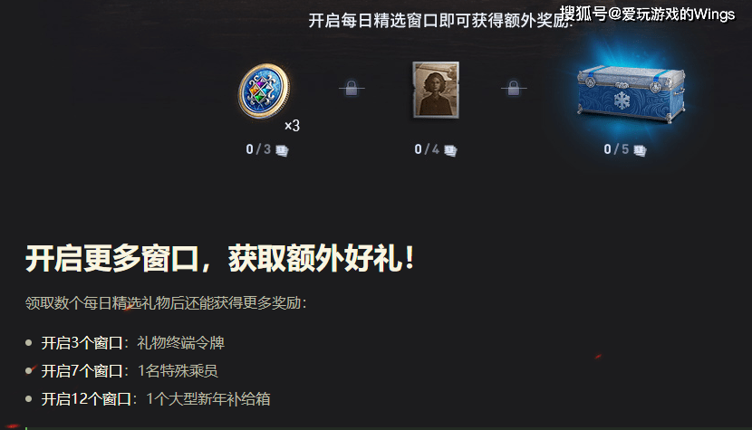 而阶段奖励则是重头戏,“阶段”可以理解为“累积天数”,每当领取3/7/12个每日精选礼物,即登录满指定的天数后,就可以获得1枚礼物终端令牌/1名特殊乘员/1个大型新年补给箱的奖励!
