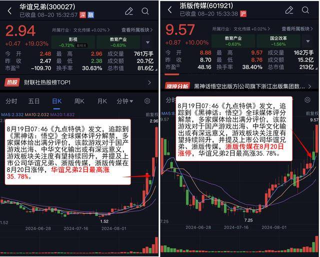 8月19日07:46《九点特供》发文, 追踪到《黑神话:悟空》全球媒体评分解禁,多家媒体给出满分评价,该款游戏对于国产游戏出海、中华文化输出或有深远意义,游戏板块关注度有望持续回升,并提及上市公司华谊兄弟、浙版传媒, 浙版传媒在8月20日涨停,华谊兄弟2日最高涨35.78%。