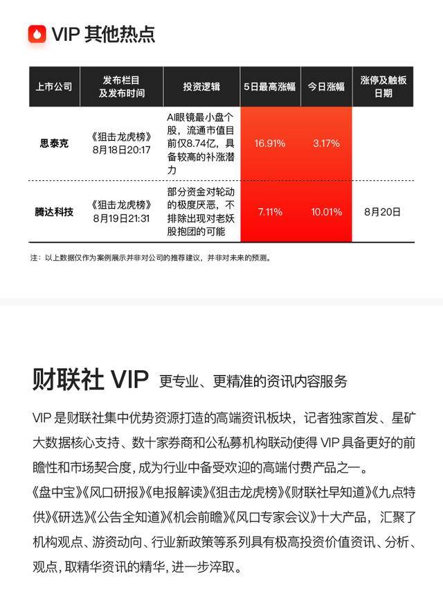 注:财联社VIP为内容资讯产品,并非投资建议。以下内容仅为资讯价值展示非对相关公司的推荐建议,非未来走势预测。投资有风险,入市需谨慎。