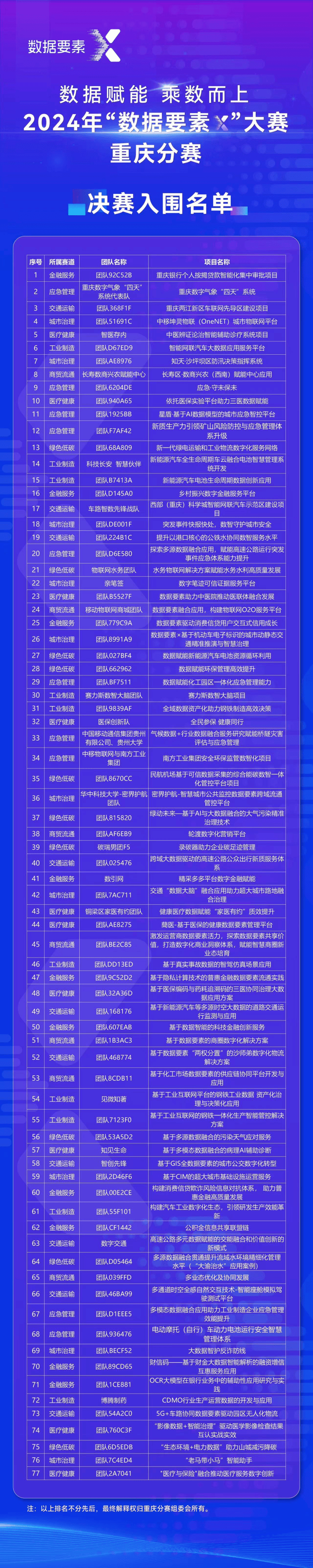 日前,2024年“数据要素×”大赛重庆分赛初赛在两江新区开赛,8个赛道角逐争锋。最终,8个赛道共计77个项目入围决赛。