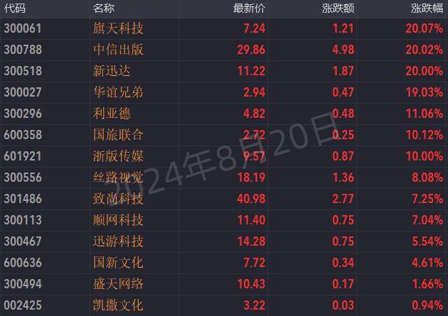 8月20日,《黑神话:悟空》的正式上线后,旗天科技(300061)、中信出版(300788)、华谊兄弟(300027)等股票实现20CM涨停,浙版传媒(601921)此前也触及涨停,而利亚德(300296)和致尚科技(301486)分别涨超13%和11%。