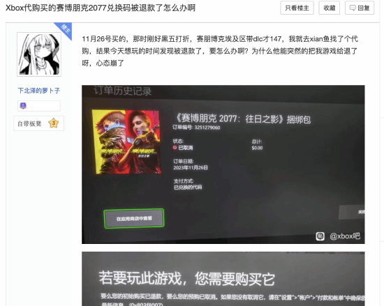 Xbox低价区虽然香,但是要想在低价区购买游戏需要当地信用卡,还是有一定的门槛的。这就催生出来了一些游戏代购生意,而且玩家找人代购也面临着一些风险。近日,就有位网友称自己花147元找代购买的《2077》兑换码被退款了。