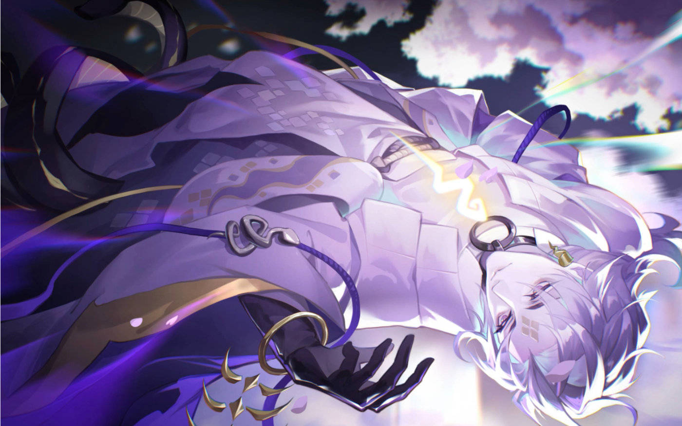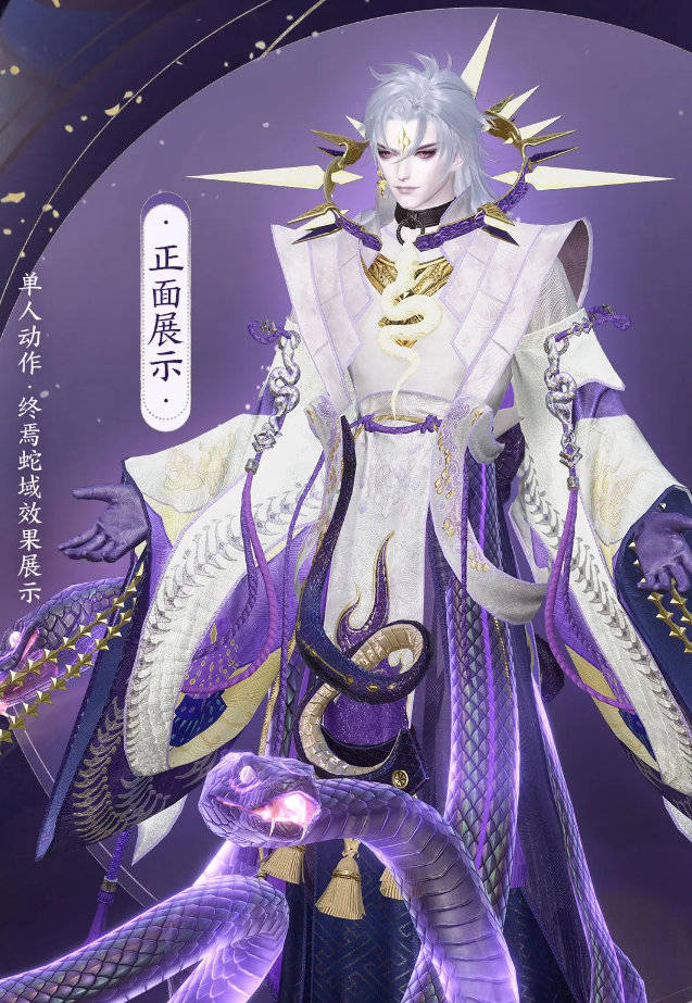 神堕八岐大蛇同款时装【堕神绝渊】时装以深邃的紫色为主调,如夜晚的星辰般神秘而迷人,与纯白色交织成独特的视觉效果。衣身的剪裁经过精心设计,流线型的线条勾勒出角色挺拔的身姿,展现出一种自然的威严与气质。长袍的袖摆宽大而飘逸,展现出昔日神明的风范。