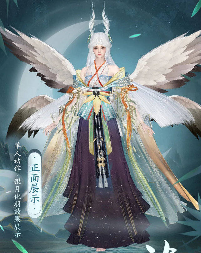 时装胸前,绿色与橙色的丝带相交错,巧妙地融入了这抹月之华彩中。绿色象征着春天的勃勃生机,而橙色则带来了如秋日般的温暖,让服装充满了自然的气息。星河效果的图案如同宇宙中的星辰点点,而轻盈的薄纱随着动作轻轻飘动,犹如月光洒落的柔美光影。薄纱的透明感与星河图案相互映衬,既保留了神明般的华丽感,又增添了几分梦幻与柔和。