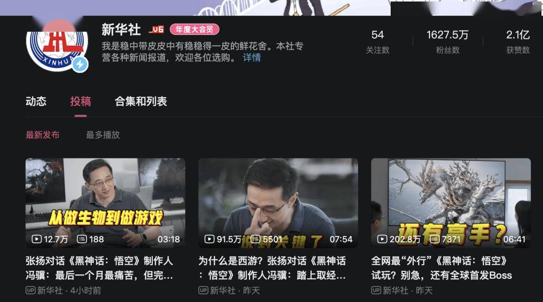 不止于此,就在《黑神话:悟空》正式上线前不久,新华社记者特地赶至「游戏科学」,接着一连发了三条视频,主动记录并宣传《黑神话:悟空》,这等待遇,实属罕见。