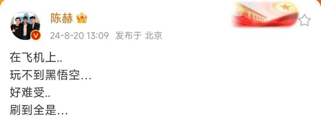 明星陈赫在飞机上发了一条哀怨的微博,为自己暂时玩不到《黑神话:悟空》而惋惜。