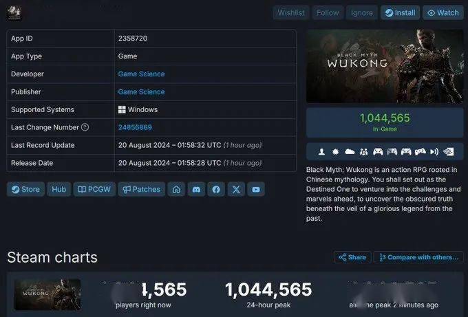 在中午十二点,仅steam一个平台的同时在线玩家数便超过了100万,这款游戏更是始终占据steam热玩榜第一的位置。