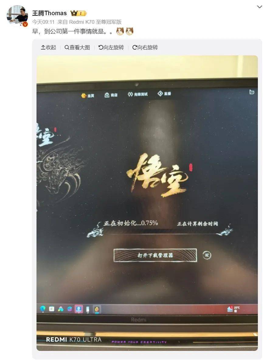 Redmi品牌总经理王腾发微博表示,自己到公司第一件事情就是下载《黑神话:悟空》,“公然摸鱼”。