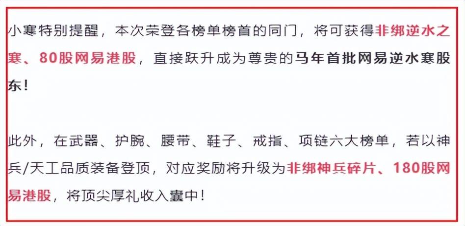 有了比赛没彩头怎么行,官方为这次神兵谱建立了各个部位的独立比拼,以不同部位的装备进行评分排行,登上榜单榜首的玩家,不仅能拿到稀有的装备词条逆水之寒,还有80股网易港股(约等于1.4万人民币)