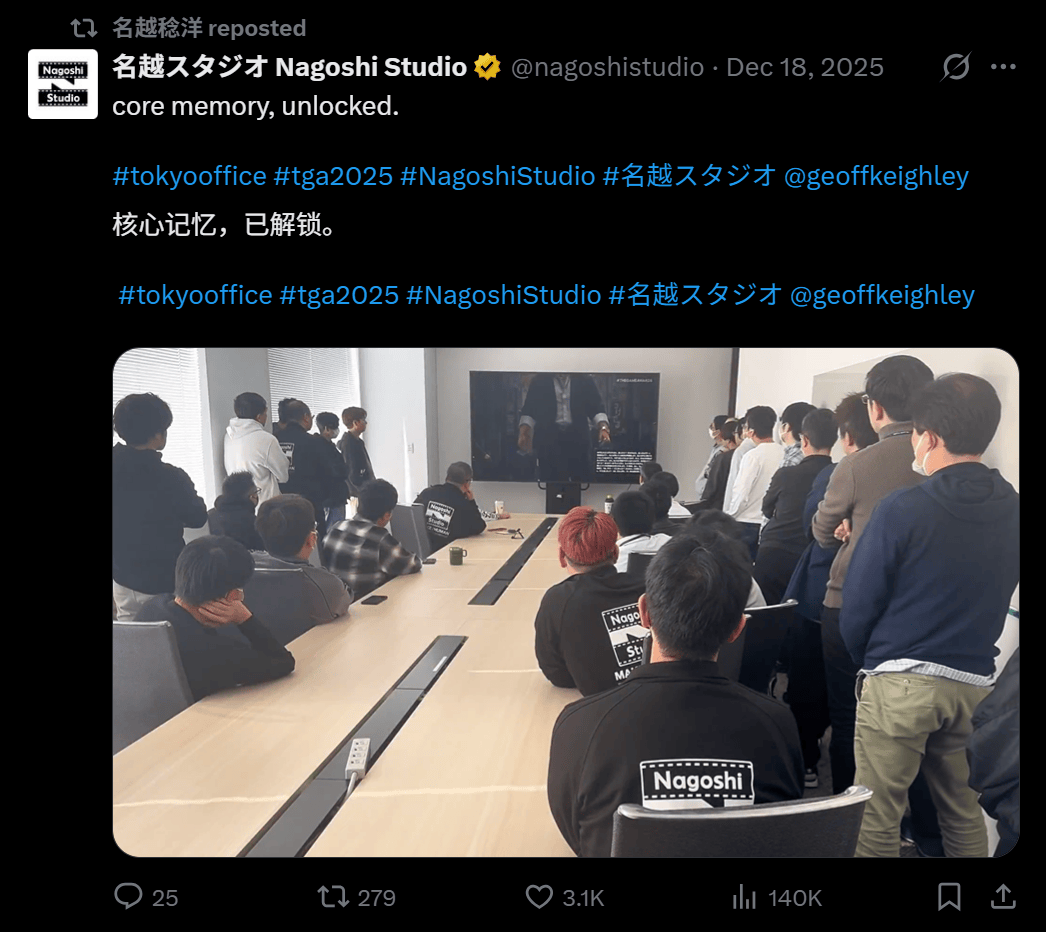 当时名越工作室的官推还发了工作室成员们聚在会议室一起看TGA的视频,配文案“核心记忆,已解锁”