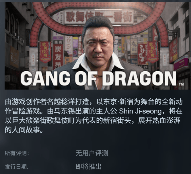 该作由韩国知名演员马东锡担当主角脸模,从宣传片来看,仍是以东京新宿的歌舞伎町一番街为舞台,讲述黑帮故事——甚至给人几分和世嘉旗下现在的如龙系列正面叫板的感觉。
