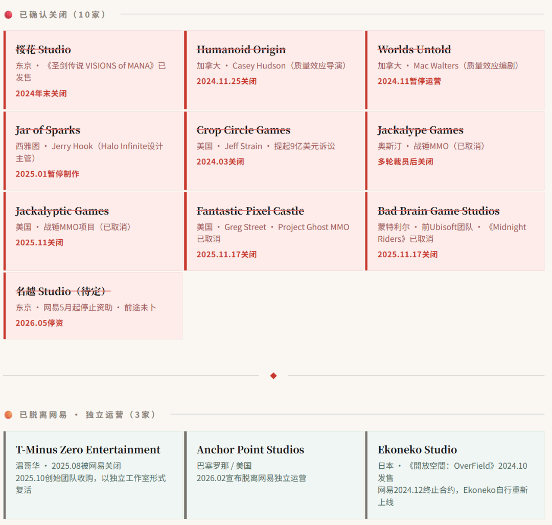 通过公开数据不完全统计,名越工作室如若正式停运,则将是网易自2022年向海外扩张工作室群、再到近年来战略回撤之后,关闭的至少第10家全资或控股的海外工作室。另有3家已脱离网易独立运营。
