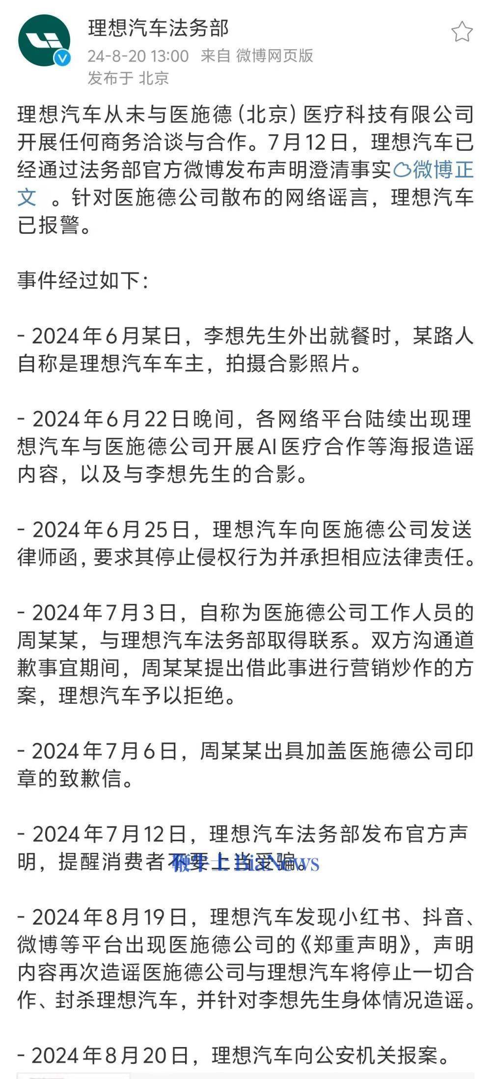 理想汽车法务部今日下午发文表示,理想汽车从未与医施德(北京)医疗科技有限公司开展任何商务洽谈与合作。针对医施德公司散布的网络谣言,理想汽车已报警。对此,理想法务部对事件经过作出了详细梳理: