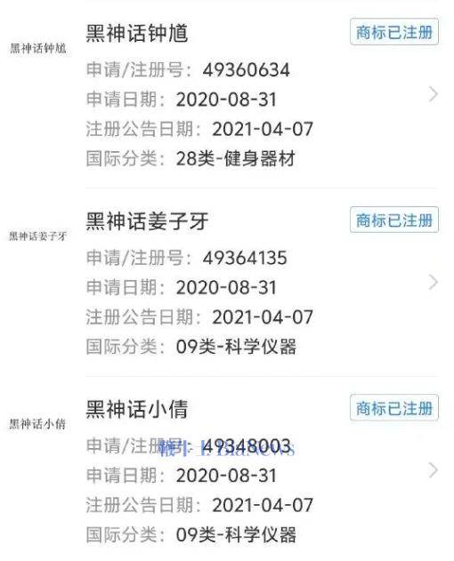 此外,该公司还成功注册了"黑神话姜子牙"、"黑神话钟馗"等商标。