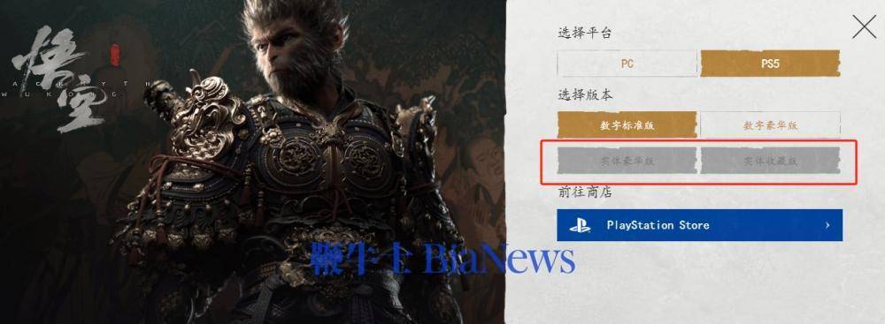 《黑神话:悟空》官网显示,该游戏共四个版本,分别是售价268元的数字标准版,328元的数字豪华版,820元的实体豪华版和1998元的实体收藏版。官方销售页面显示,目前PS5端的实体版已无法购买,均已售罄。