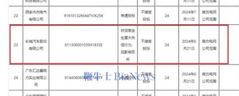 3、南方电网通报失信供货商:长城汽车禁止投标24个月