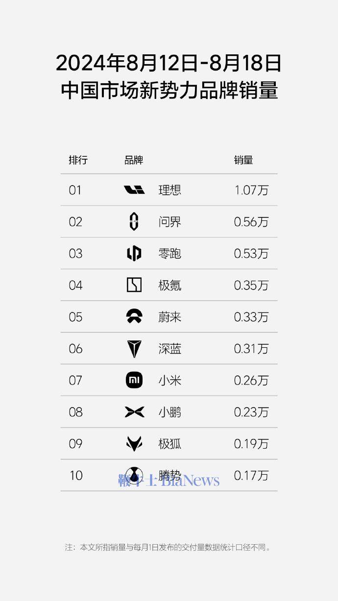 8.12-8.18中国市场新势力品牌销量: